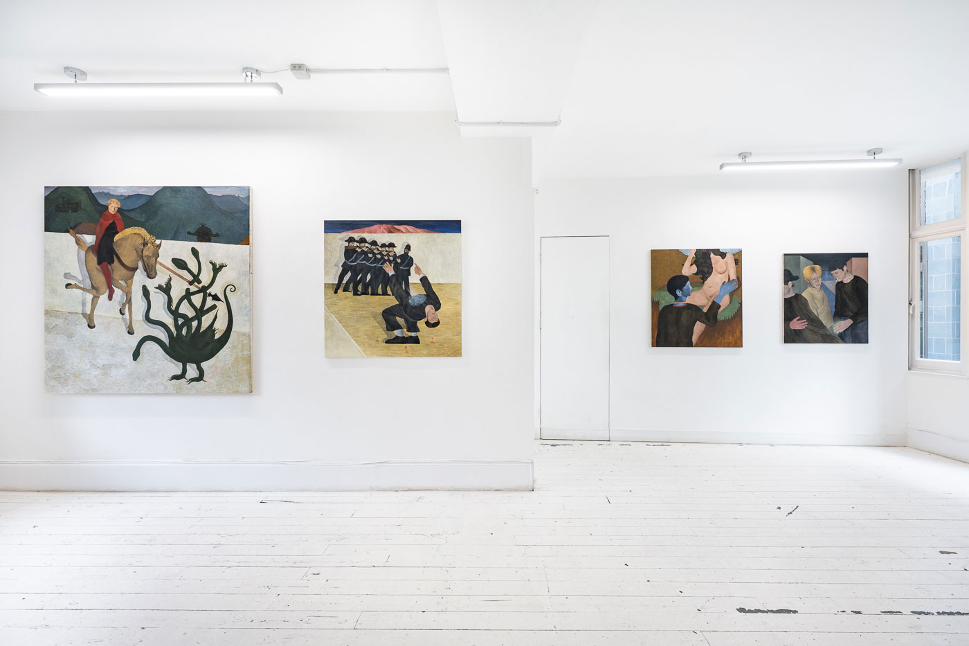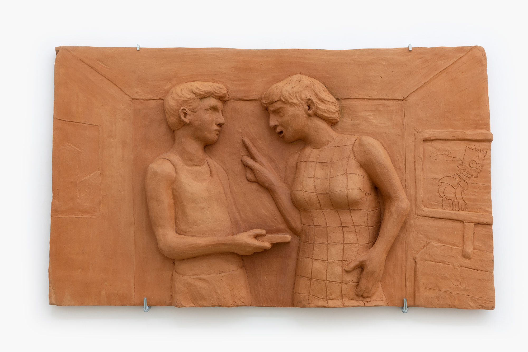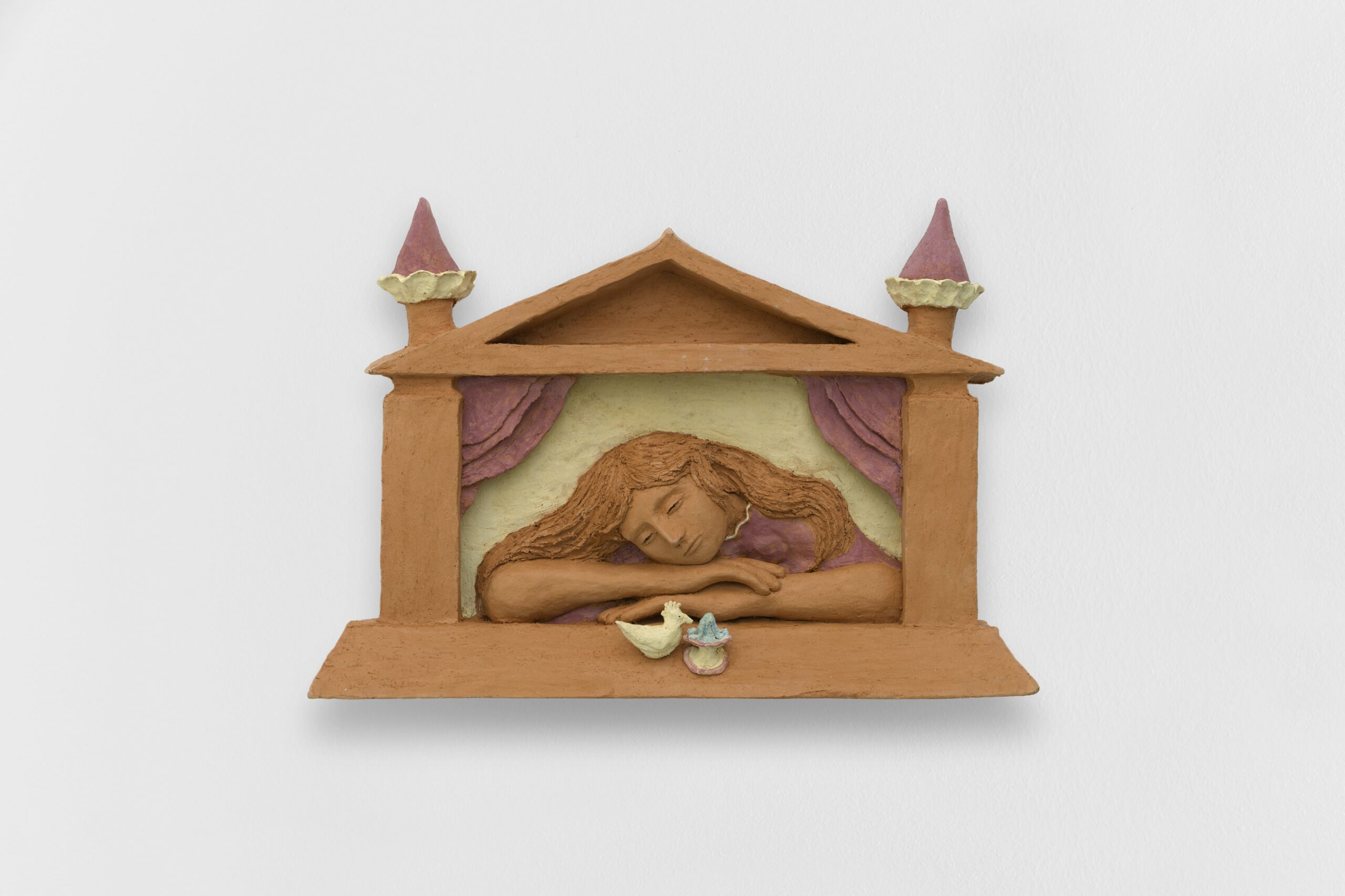 La nostra visione non va oltre ma intercetta quegli elementi estranei all’ordine formale e narrativo che si presentano in maniera quasi epifanica tra le pieghe di un tessuto o su un pavimento, come gli acrobati sui cavalli (Equilibrista) o le orecchie elfiche del Burattinaio. Questi elementi instaurano una relazione inafferrabile con il contesto ma non rimandano a un’altra realtà, ci fanno inabissare nello spazio dell’immaginazione dove il pensiero non si è ancora trasformato in parola, dove i riferimenti si slegano e le forme si liberano, consentendoci di ricominciare il gioco delle associazioni e dei riconoscimenti. Allestiti in continuità con i dipinti, i bassi rilievi sono veri e propri teatrini in miniatura, istantanee tridimensionali che grazie alla loro stessa struttura semichiusa presuppongono un osservatore esterno, oltre al pubblico, spesso presente anche nei dipinti, rendendo più articolato e complesso il rapporto tra vedere e immaginare che proprio il teatro, e il cinema in seguito, hanno portato alla sua massima tensione ed espressione. In questi lavori l’azione è ridotta a un gesto, a un sussurro o a uno sguardo, a un momento di riposo. Le dimensioni minute conferiscono intimità ma non sottraggono forza al trionfo dei due guerrieri-amici che si tengono saldi e fieri su un veliero in mare (Amici all’Avventura) o alla fanciulla che abbraccia la sua paura (Scheletro con Fidanzata). I soggetti dei bassi rilievi somigliano a protagonisti di mitologie epiche ma non sono eroi, sono giovani sognanti in ambientazioni fiabesche che sembrano essersi travestiti per inscenare un nuovo gioco. È il gioco dell’immaginazione in questa pièce, Teatrino, dove il grande burattinaio è l’artista stesso.