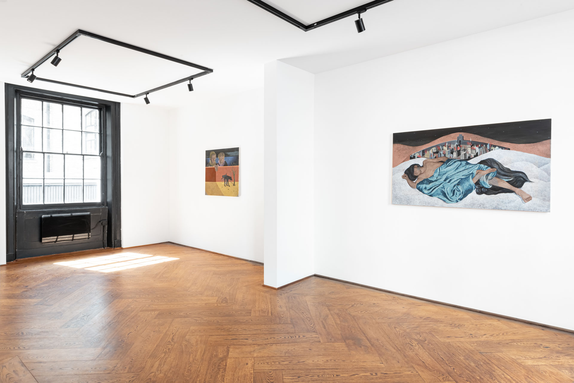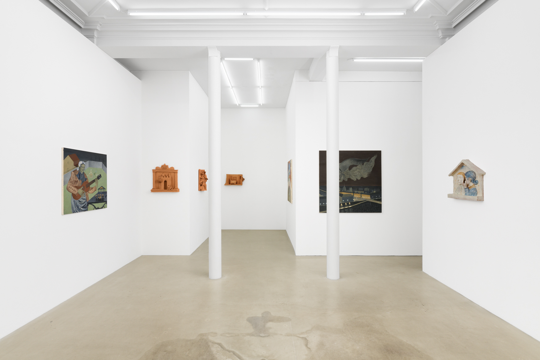 Teatrino è un progetto espositivo dell’artista italiano Leonardo Devito (Firenze, 1997) realizzato per la sua prima mostra personale negli spazi della Galleria Ciaccia Levi di Parigi. Opere pittoriche e bassi rilievi tessono un racconto dedicato all’immaginario dello spettacolo popolato da attori, personaggi reali o immaginari che mettono in scena delle rappresentazioni in bilico tra un senso tragico del vivere, alienazione, e comicità. Alcuni di questi soggetti, come il trapezista e il digiunatore di Kafka, protagonisti degli ultimi racconti dello scrittore che si realizzano l’uno nell’isolamento sul trapezio e l’altro nell’astinenza dal cibo, fanno della propria vita un’opera, per una devozione all’arte che spesso rimane incompresa al pubblico. Altri soggetti sembrano appartenere all’immaginario fiabesco, catapultati in un tempo astorico. Entrando in mostra, un senso di familiarità pervade la nostra visione che ritrova nel fondo della memoria un gesto, uno sguardo, una storia.