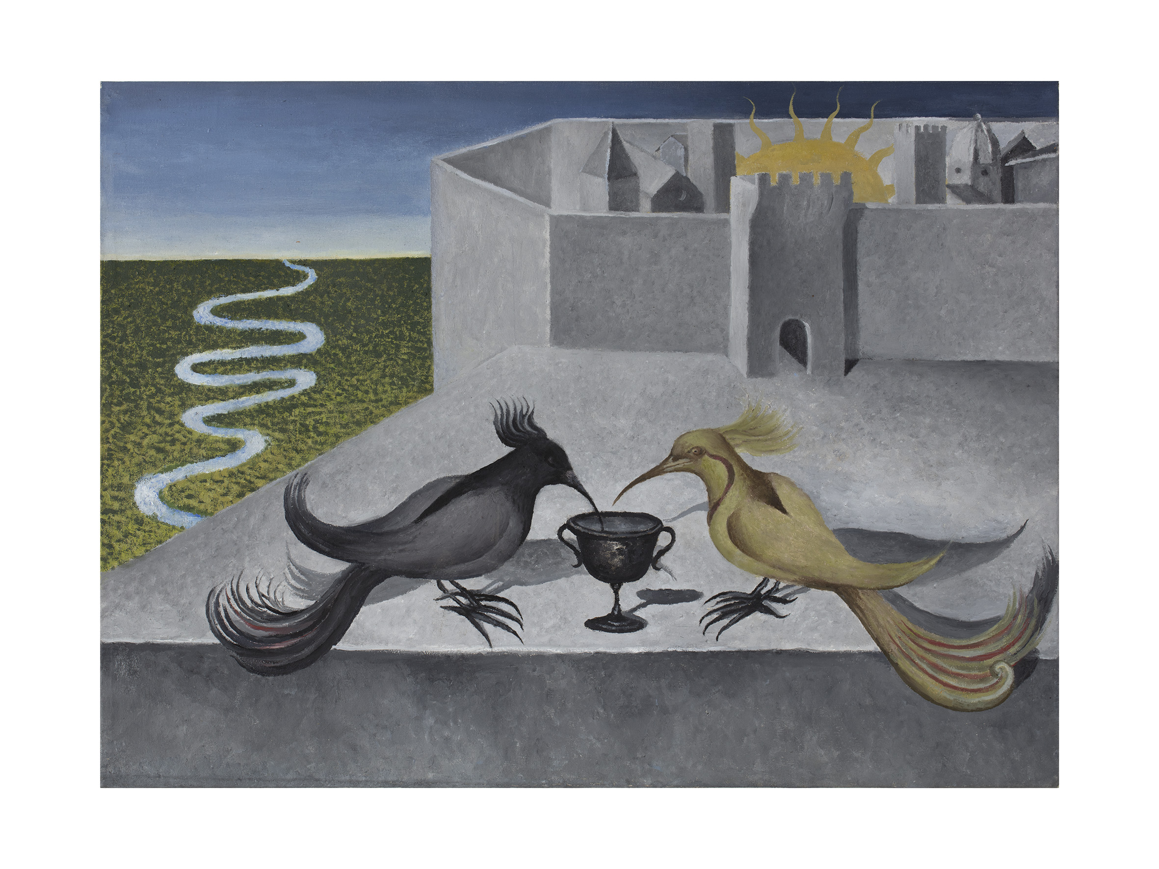 In Primo giardino, più alberi sembrano essere cresciuti nella città rinchiusa e non sono più senza foglie. Eppure, sono tutti traslucidi e sono protetti da tre pupazzetti piccoli e altrettanto traslucidi. «Ho aggiunto quei pupazzetti perché volevo che il dipinto fosse meno serio e più divertente», mi spiega Devito. «Sono come i piccoli giocattoli che trovi negli ovetti Kinder».